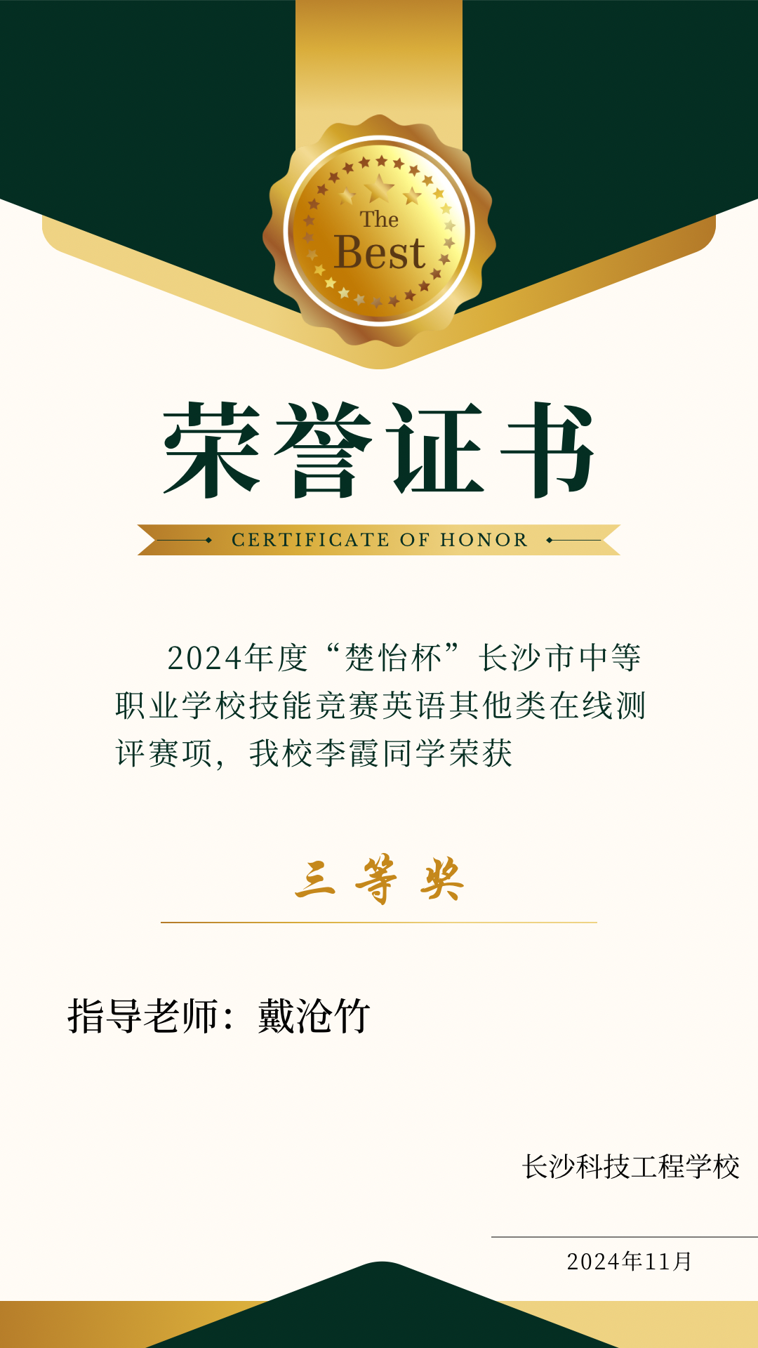 長沙科技工程學(xué)校近日捷報頻傳。在剛剛結(jié)束的2024年度“楚怡杯”長沙市中等職業(yè)學(xué)校技能競賽中,我校戴滄竹、陳喜老師指導(dǎo)的姜夢萱、蔣嚴昊、文子杰、李霞同學(xué),獲得了4個三等獎的好成績。這次比賽,充分展示了我校在教育教學(xué)工作的豐碩成果,向所有獲獎學(xué)生和指導(dǎo)教師表示熱烈的祝賀和衷心的感謝!愿我校在接下來的各項競賽中再創(chuàng)佳績,續(xù)寫輝煌篇章!
