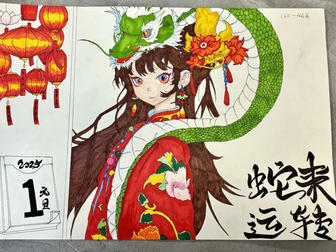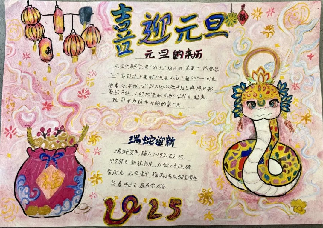 同學(xué)們參與熱情很高,從主題選定到排版設(shè)計,從勾勒描畫到上色,從版面美化到整體效果,人人緊扣主題,充分發(fā)揮了豐富的想象力和創(chuàng)造力,給人以賞心悅目的感覺。通過圖畫的方式詮釋了各自對元旦的理解。