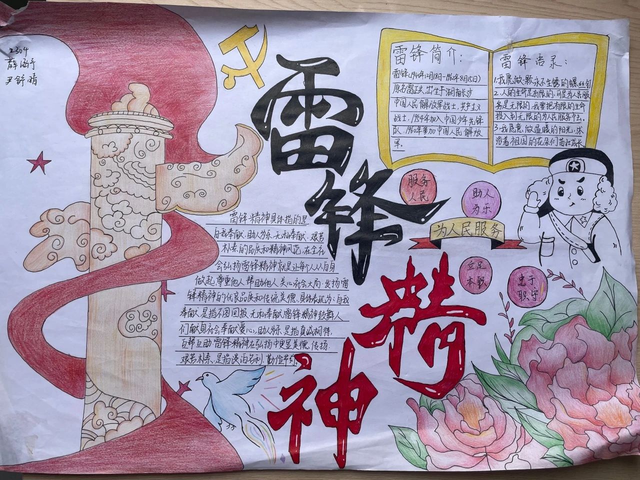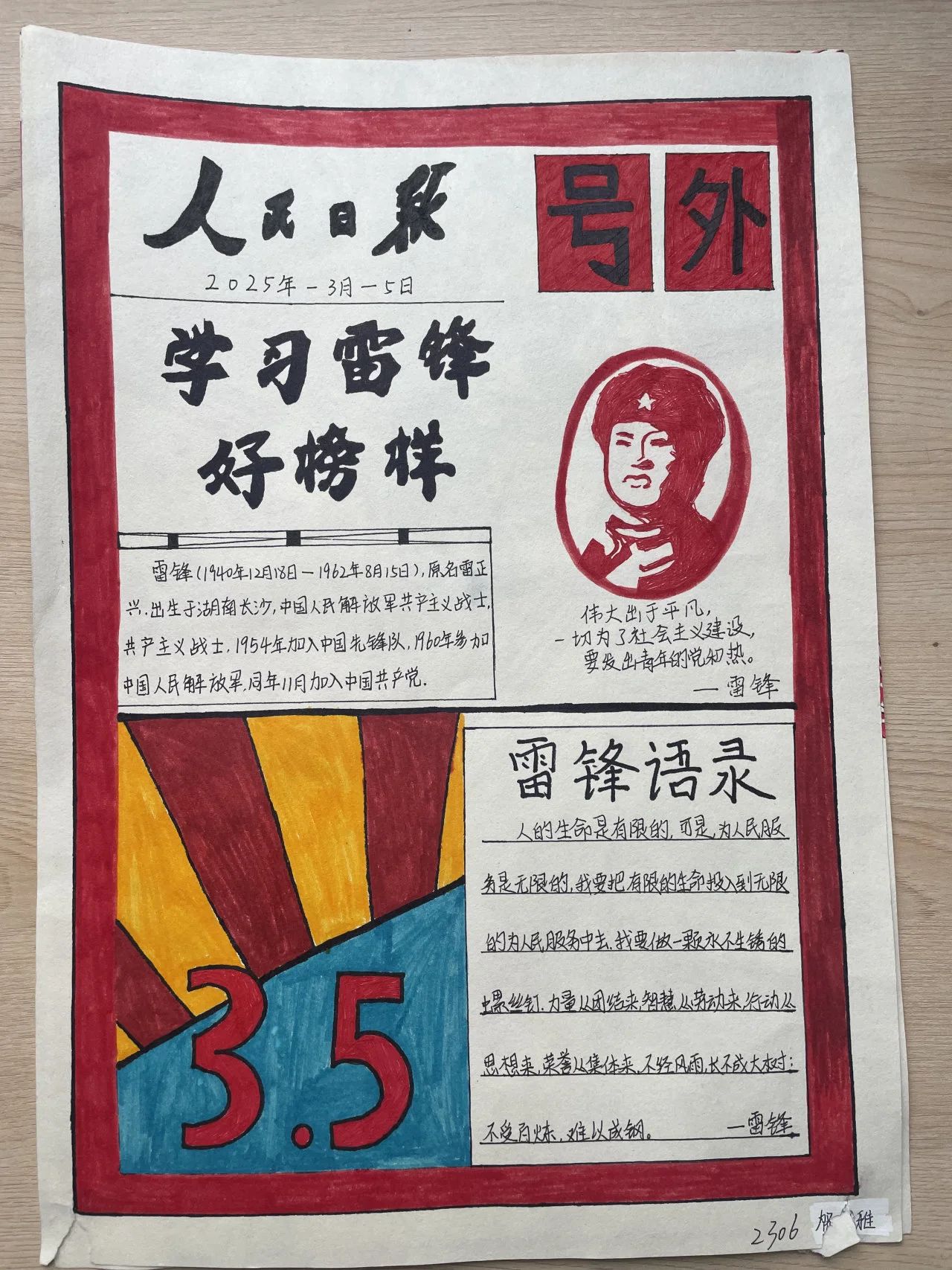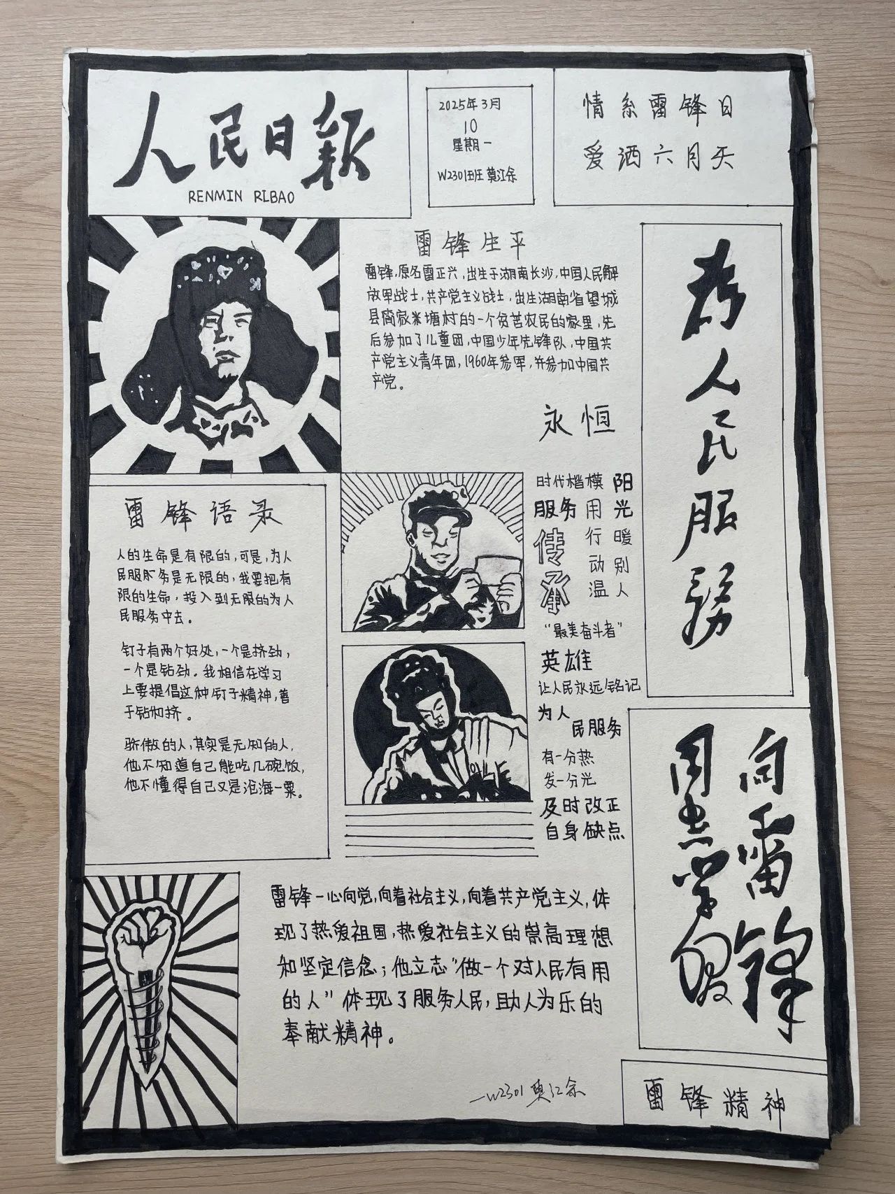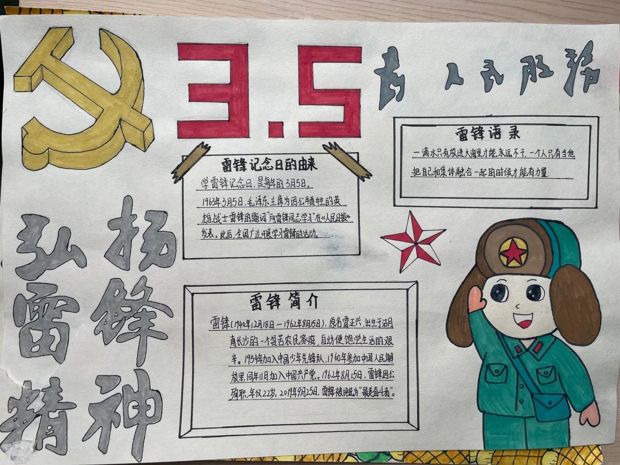各班級同學(xué)以小組或個(gè)人為單位,精心構(gòu)思、認(rèn)真繪制手抄報(bào),展現(xiàn)自己對雷鋒精神的理解。收集到的手抄報(bào)作品主題鮮明,內(nèi)容豐富,形式多樣。有的用生動(dòng)的繪畫展現(xiàn)雷鋒的形象,有的通過工整的文字闡述雷鋒精神的內(nèi)涵,還有的列舉了身邊的雷鋒式好人好事。